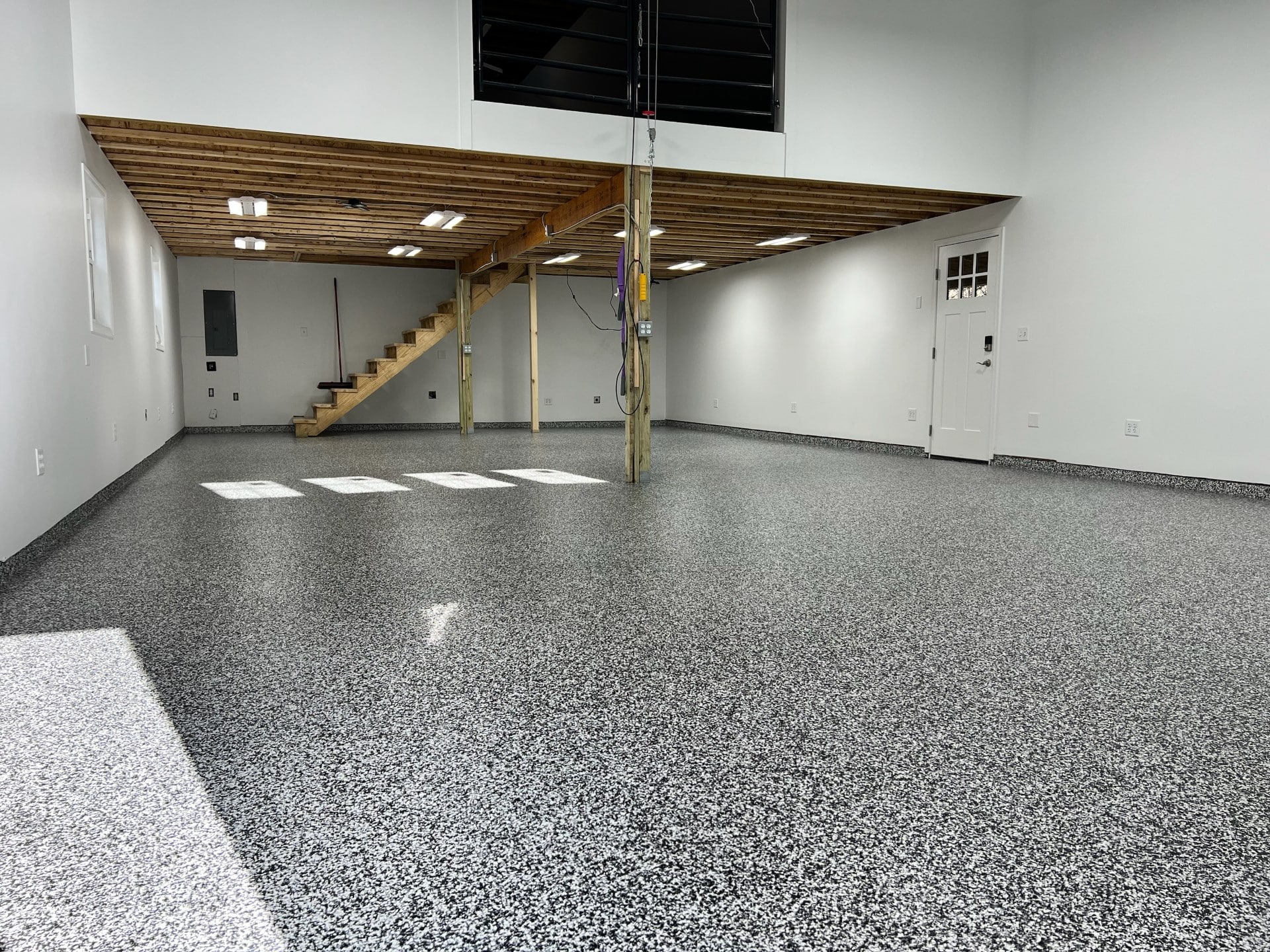 A 100% solids, BPA-free industrial grade polymer is applied. Decorative color flake (vinyl chips) are expertly broadcast over the surface, in choices of 1/4” or 1/16” flake. Our flake coverage is considered a “full-broadcast.” The flakes provide an essential layer of traction underfoot; for this reason we rarely do a “partial flake” floor.